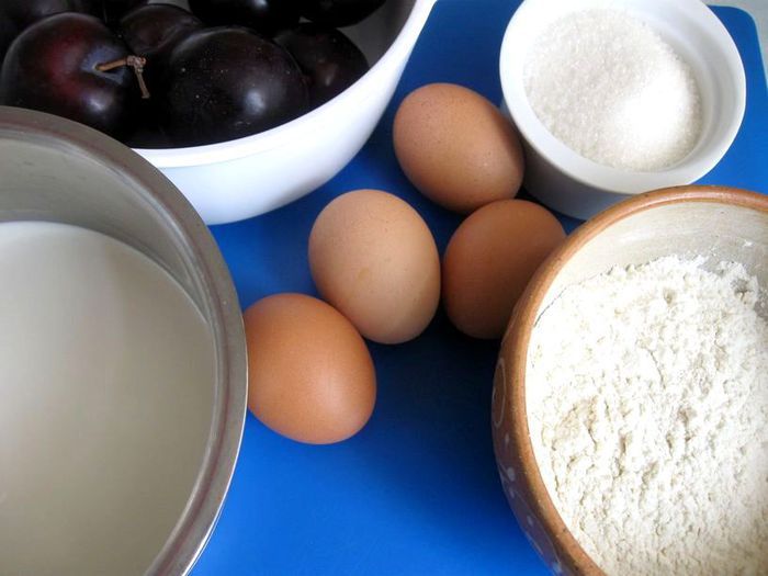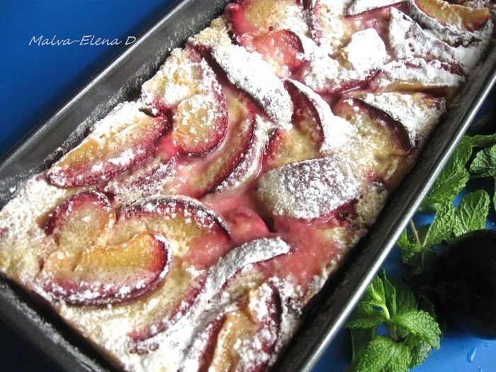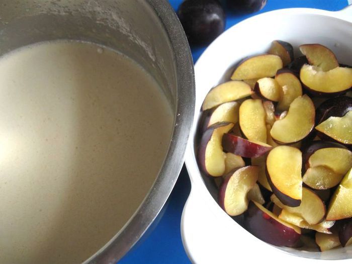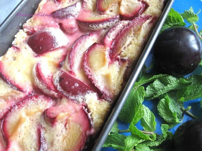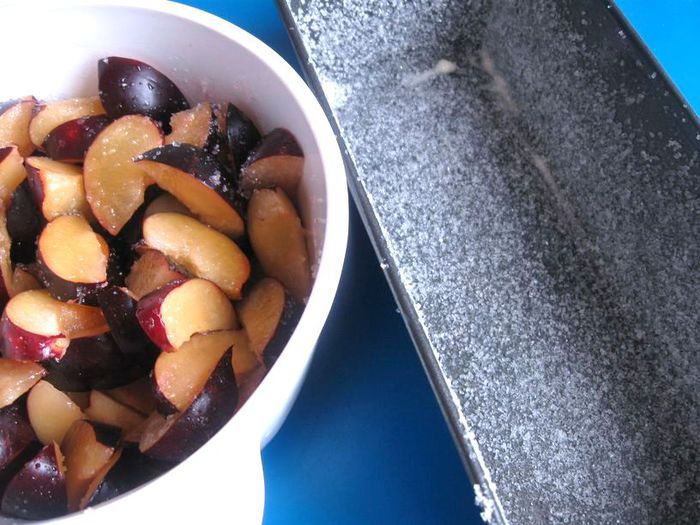 Со сливами этот десерт особенно красив и вкусен, сохраняется кислинка сливы, которая очень хорошо гармонирует с нежным тестом (можно взять разноцветные сливы).