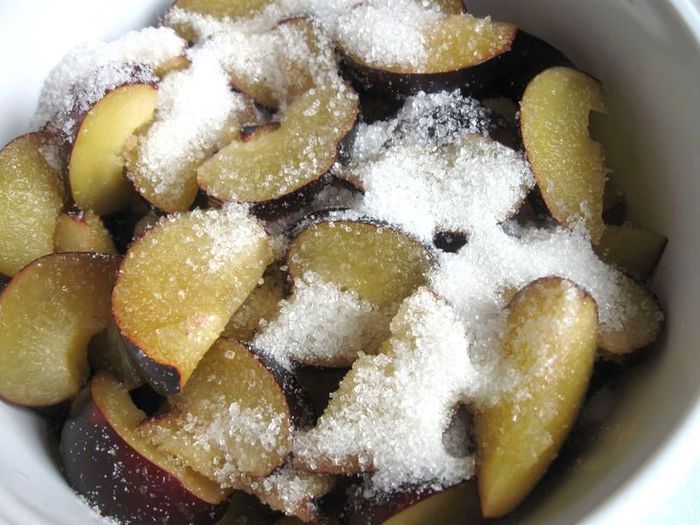Поместить сливы в смазанную сливочным маслом и присыпанную 2 ст. ложками ( 35 г) сахара форму для запекания. Обратить внимание на этот момент, форма должна «держать напыление» из песка равномерно (стенки и дно формы).