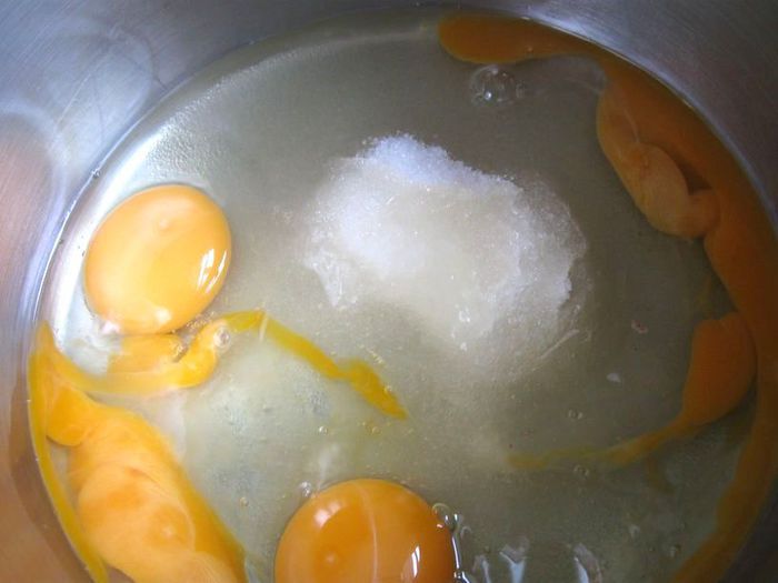 Приготовить тесто. Смешать яйца с сахарным песком (120 г). Перемешать миксером в течении нескольких минут.
