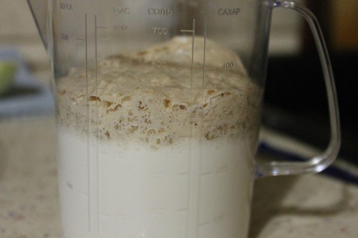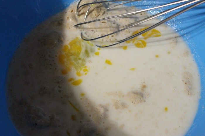 Сначала делаем опару. Молоко подогреть до теплого состояния, всыпать в него сахар, дрожжи и размешать. Оставить на 15-20 минут. До образования такой шапочки.