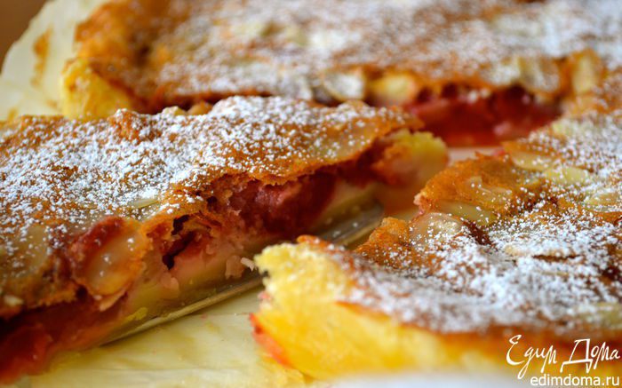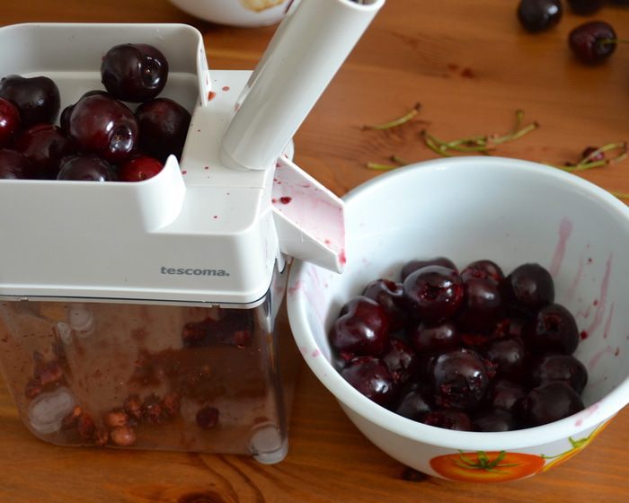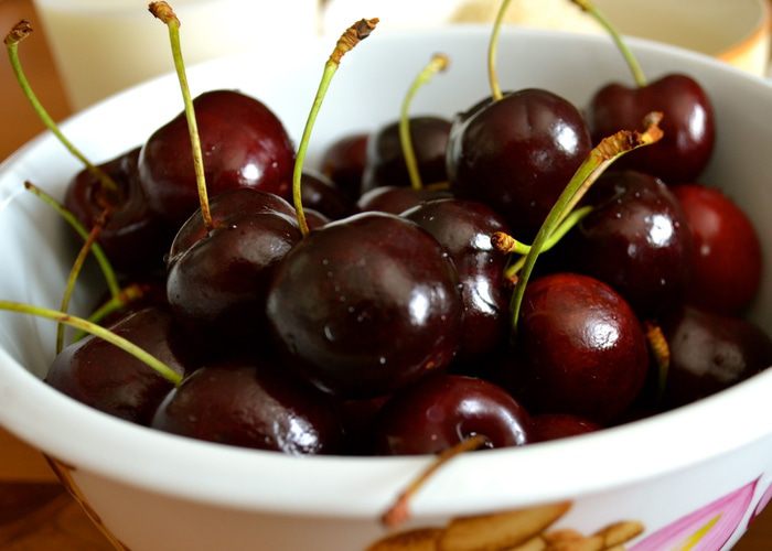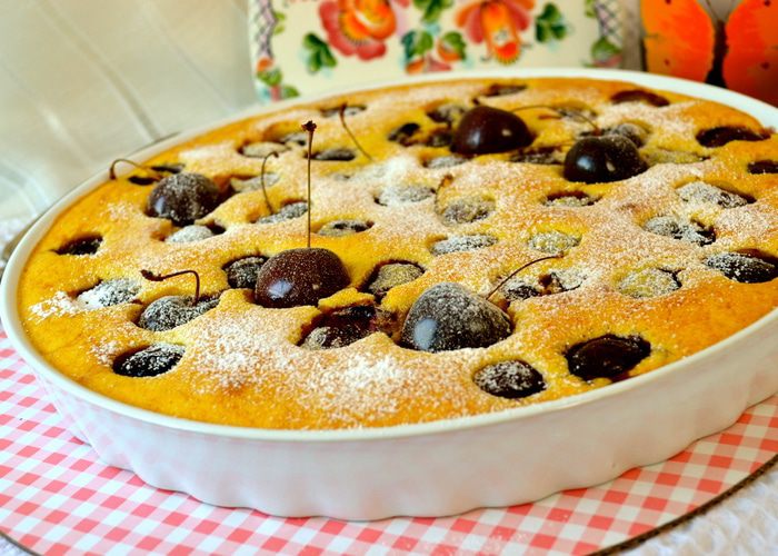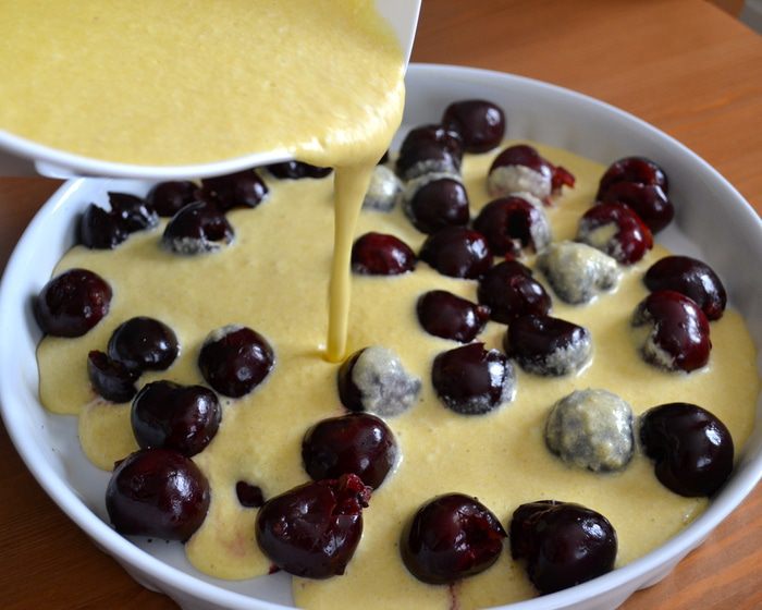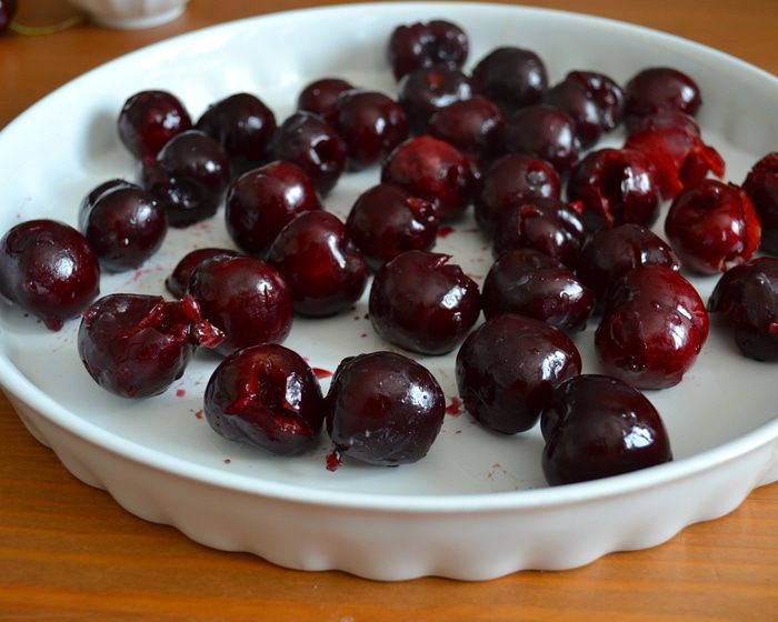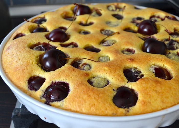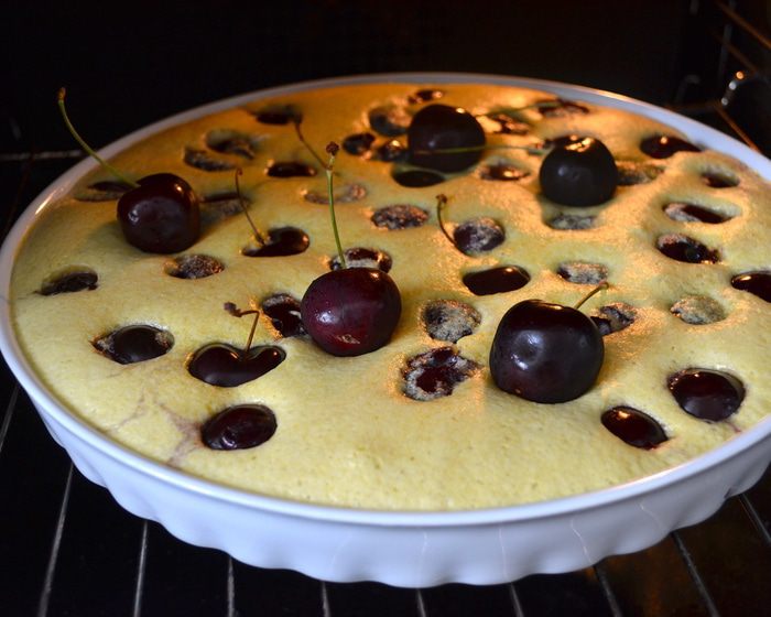 Поставить выпекаться в заранее разогретую духовку на 15 минут (при 180 С), затем понизить температуру до 150 С и выпекать еще 20-25 минут до нежного золотистого цвета! У меня получилось так, что ягодки с хвостиками, которые я выложила поверх десерта перед тем как поставить его в духовку, все утонули... ((( А мне так хотелось, чтобы они оставались на поверхности, слегка запеченные.., ну, как на картинке в книжке! ))) Поэтому, когда я понизила температуру в духовке, я просто выложила еще 5 черешен и они получились, как надо!