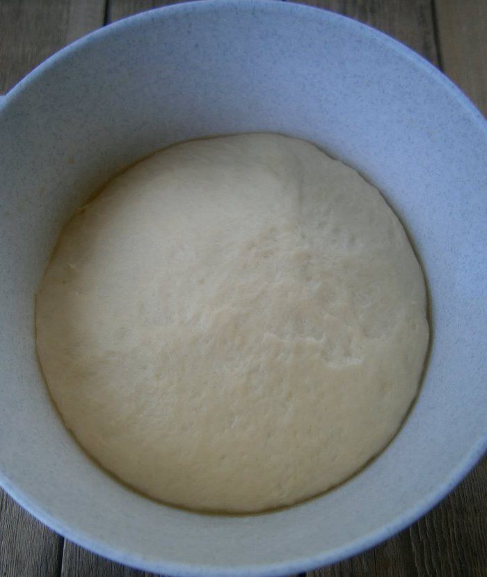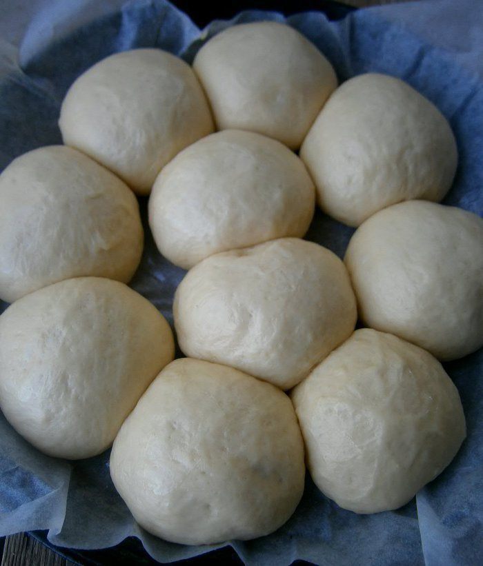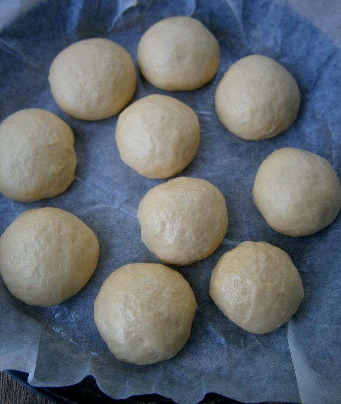 Подошедшее тесто обмять и разделить на 10 одинаковых кусочков. Сформировать круглые булочки.
