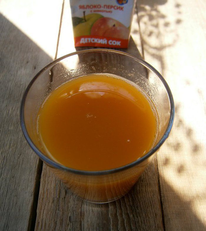 Персиковый сок подогреть до тёплого состояния ( у меня был детский, яблочно - персиковый сок с мякотью).