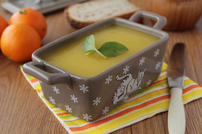 Залить поверхность охлажденного паштета остывшим апельсиновым желе, поставить в холодильник до полного застывания.