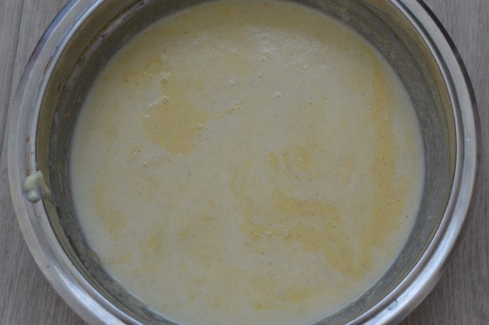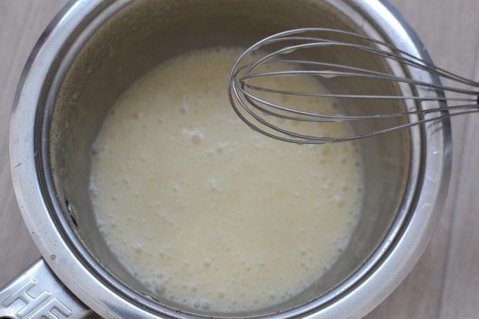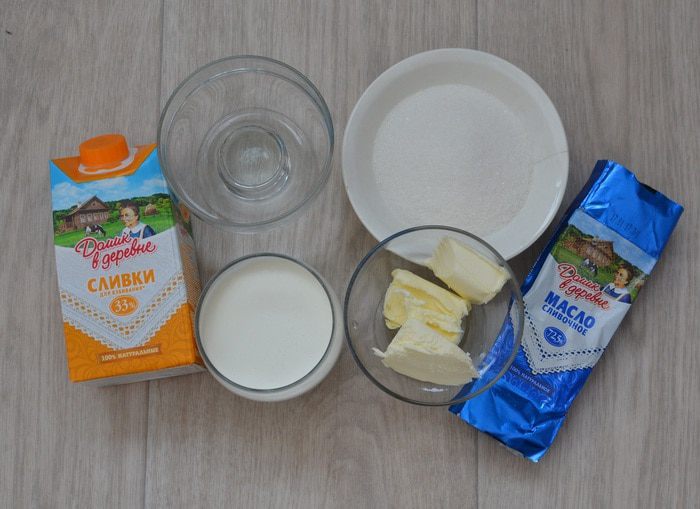 Когда масло равномерно распределится по карамели, влить горячие сливки «Домик в деревне», продолжая взбивать.