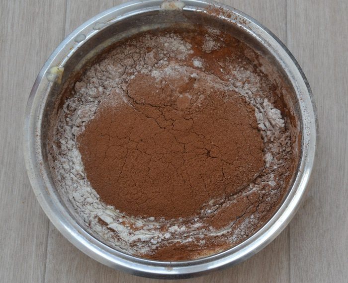 В отдельной миске просеить муку, какао, разрыхлитель, соль. Затем мучную смесь добавить в тесто, перемешать до однородного состояния.
