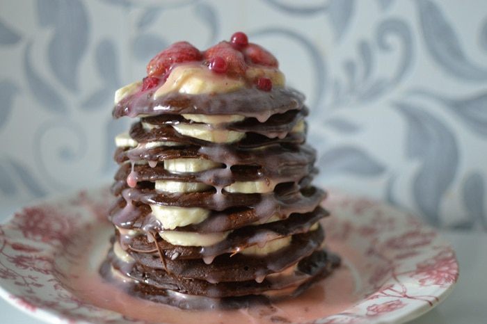 Невероятные шоколадные оладьи, дополненные карамельно-сливочным соусом, бананами и ягодами!