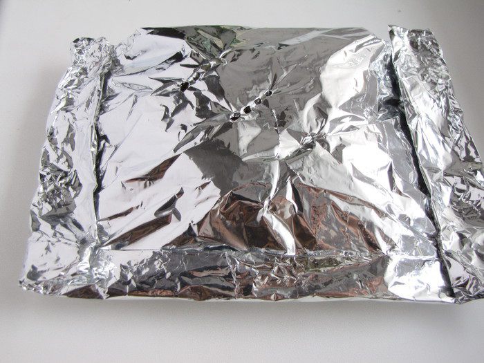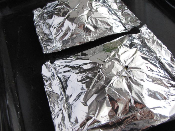 Закрыть второй половиной фольги, края подвернуть. Сделать несколько проколов вилкой для выхода пара.