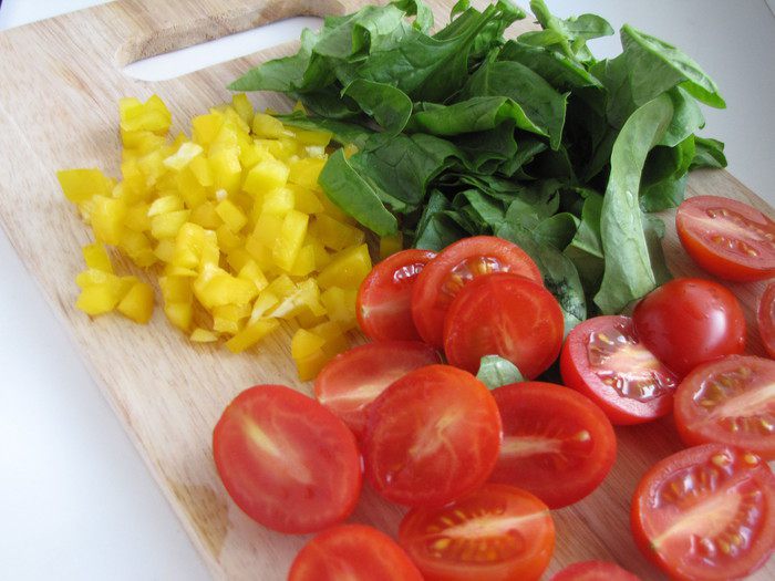 Болгарский перец нарезать мелким кубиком, черри разрезать на половинки, крупно нарезать шпинат.