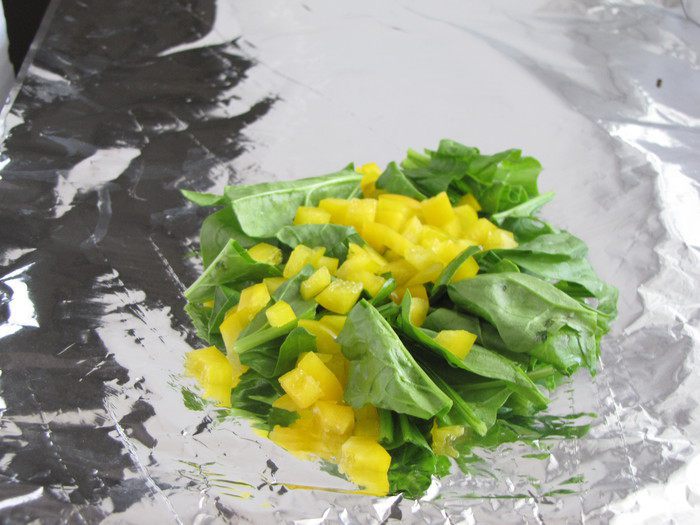 Подготовить два листа фольги. На одну половину выложить шпинат с болгарским перцем.