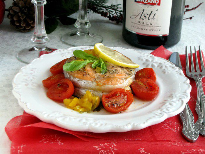 Сверху на овощи выложить подготовленную рыбу, вокруг расположить помидоры черри. Сбрызнуть оливковым маслом, игристым вином, посолить, поперчить. Сверху положить пластик лимона.