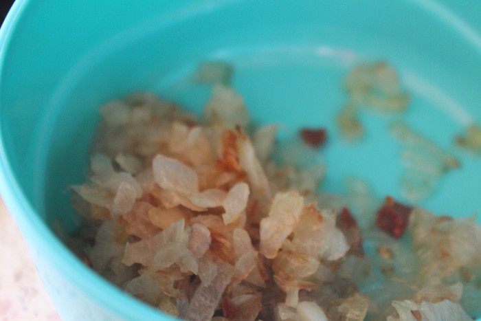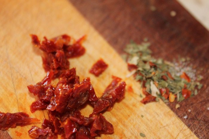 Вяленые помидоры нарезать на тонкие полоски, а затем на мелкие кубики. Смешать лук помидоры и травы.