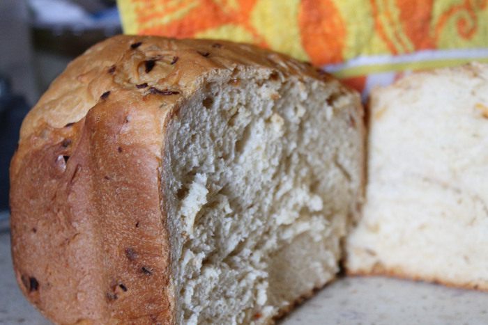 Сложить в ведерко хлебопечки все ингредиенты, сначала жидкие, добавить 1 ч.л. начинки, а потом сухие. Выбрать программу "основной", цвет корочки и размер булки. Через 30 минут, прозвучит сигнал, тогда добавить остальную начинку.