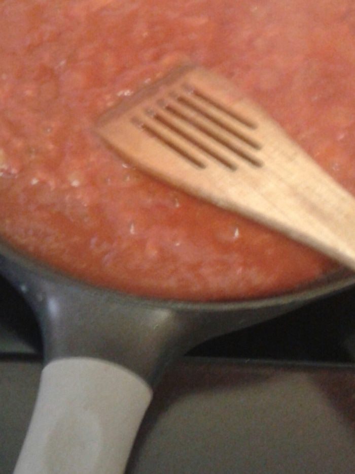 Затем часть поджарки отложить для фарша, а в остальной добавить порезанный мелко помидор (шкуру предварительно снять), томатную пасту, щепотку сахара и потушить все минут 10.