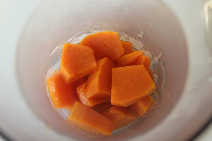 200 г тыквы нарезать кусочками, залить небольшим количеством воды и сварить до мягкости. Воду слить.
