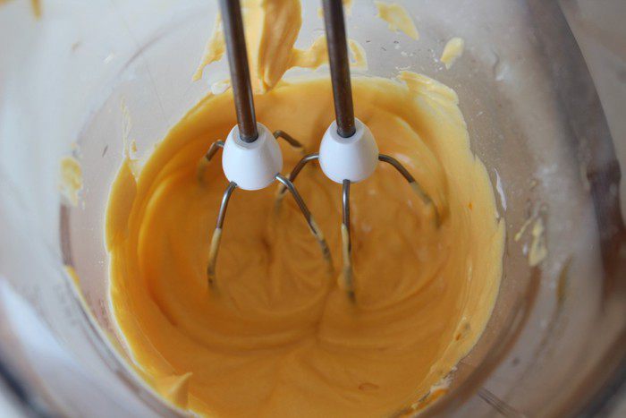 Перемешать мягкий сыр (у меня каймак) с сахарной пудрой, добавить частями тыквенное пюре и хорошо взбить до увеличения объема. Отдельно взбить охлажденные сливки в густую пену. Аккуратно соединить обе смеси.