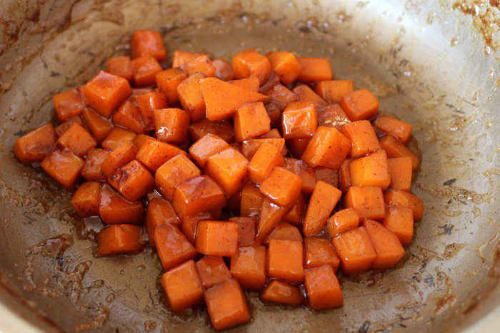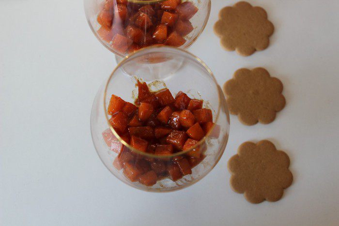 В бокалы на дно выложить тыкву в карамели.