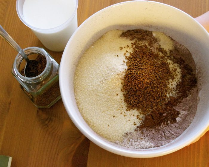 В миску просеять муку, какао-порошок и разрыхлитель. Добавить сахар, щепотку соли и 1 ст.л. растворимого кофе. Перемешать.