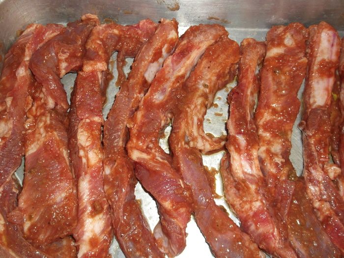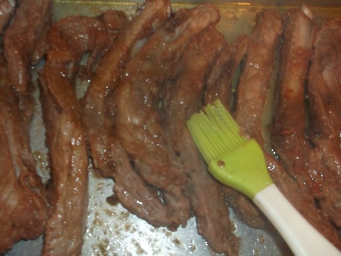 Рёбрышки разрезаем по косточкам,хорошо обмазываем каждый кусочек соусом и ставим в холодное место на 1-12 часа помариноваться (можно на ночь)