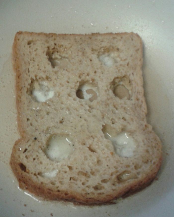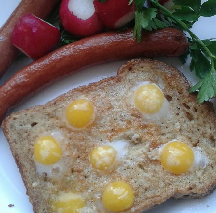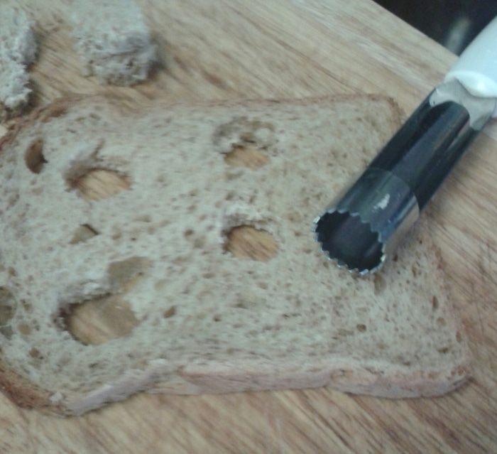 Берем хлеб для тостов и делаем в нем семь отверстий, ножом для удаления сердцевины яблока или другим кухонным гаджетом.