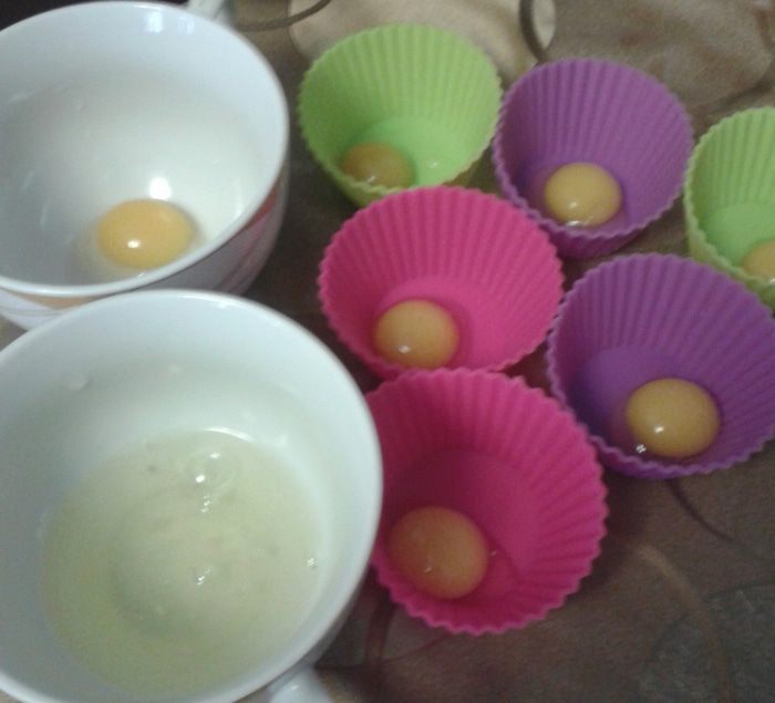 Желтки пока разложим в небольшие емкости. Белки сливаем в одну.