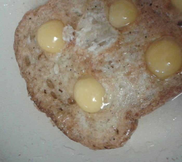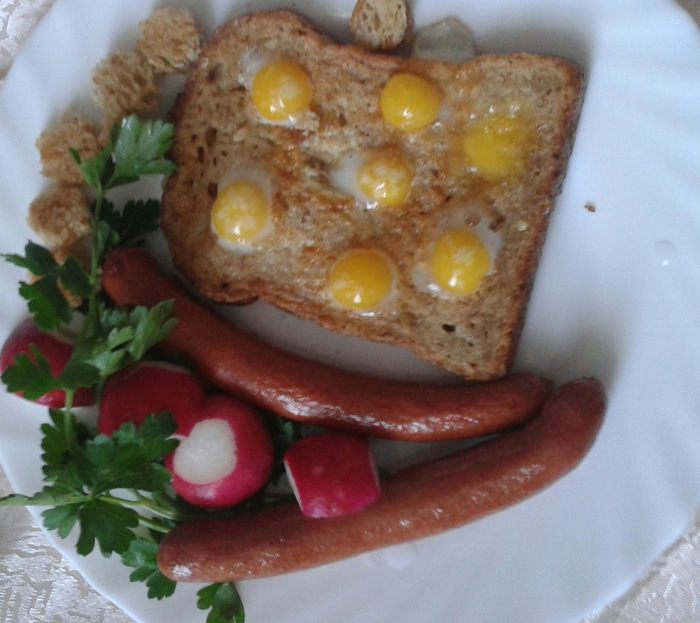 Обжариваем с одной стороны, переворачиваем, теперь в каждое отверстие заливаем желток, жарить недолго (перепелиные яйца можно есть сырыми).