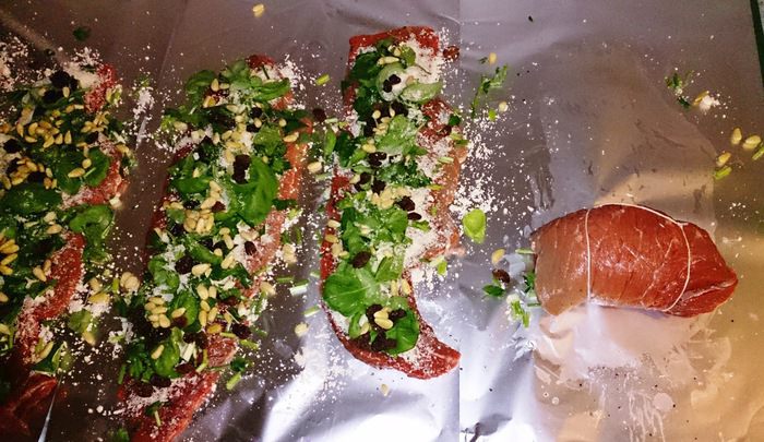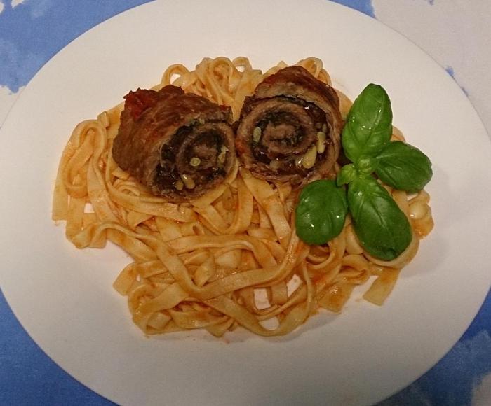 Рулеты посолить, поперчить. Тертый пармезан, рубленые петрушку, шнитт-лук и базилик, чеснок, орешки и изюм равномерно выложить на рулеты. Свернуть и закрепить либо кондитерской ниткой (у меня) либо зубочистками.
