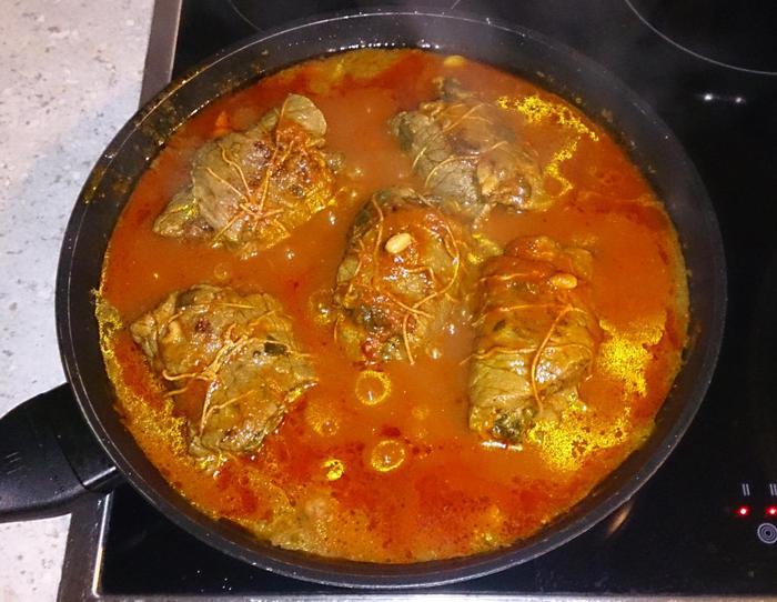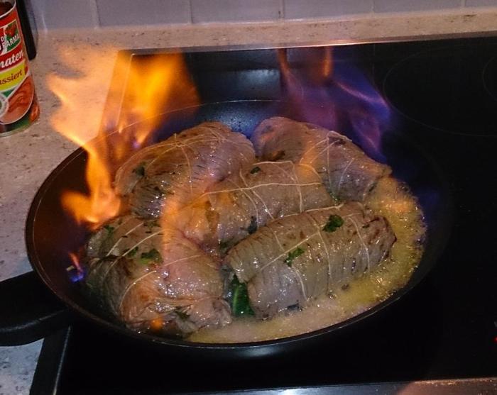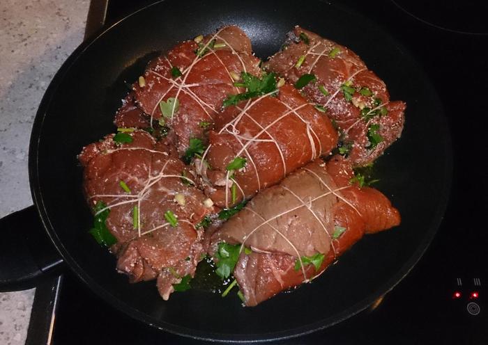 На сковороде разогреть оливковое масло и на большом огне обжарить рулеты со всех сторон, добавив при этом крупно нарезанный зубчик чеснока.