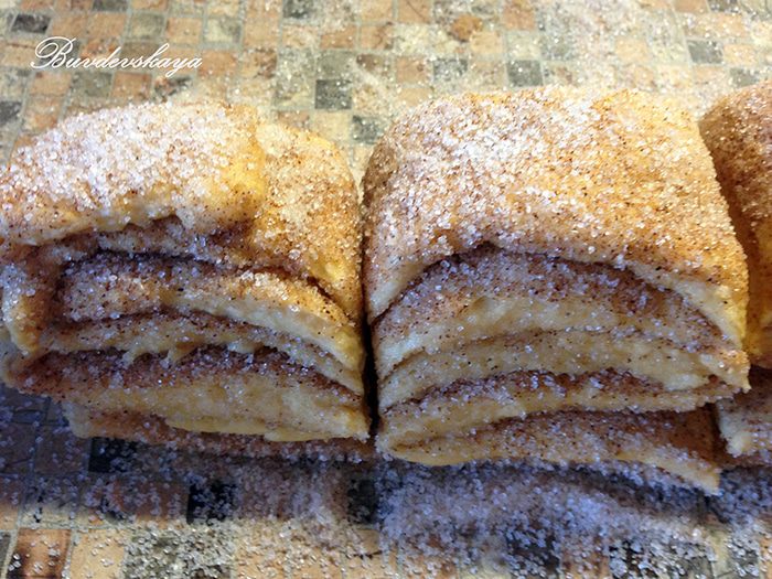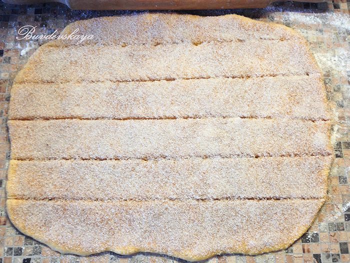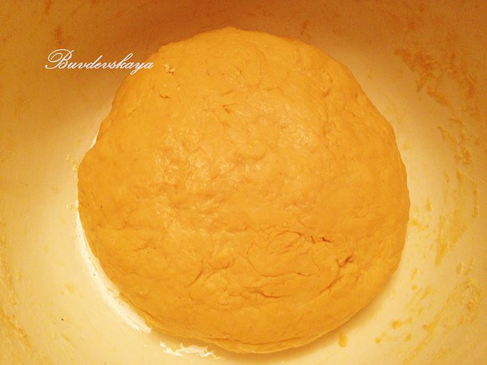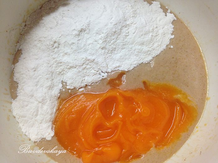 Затем добавьте пюре из запеченной тыквы, соль, стакан муки и перемешайте. Введите остальную муки и замешивайте тесто в течении 6 минут. Тесто должно быть эластичным и немного липким. Если оно слишком влажное по чуть-чуть добавляйте муку, пока не достигнете нужной консистенции.