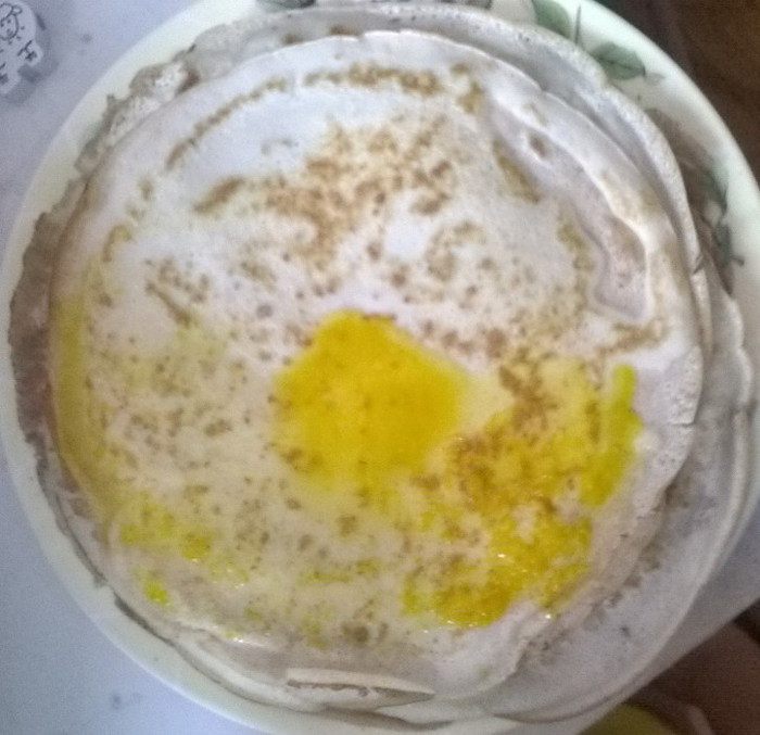 На топленом масле поджарить тонкие блинчики. Сложить стопкой и держать в тепле.