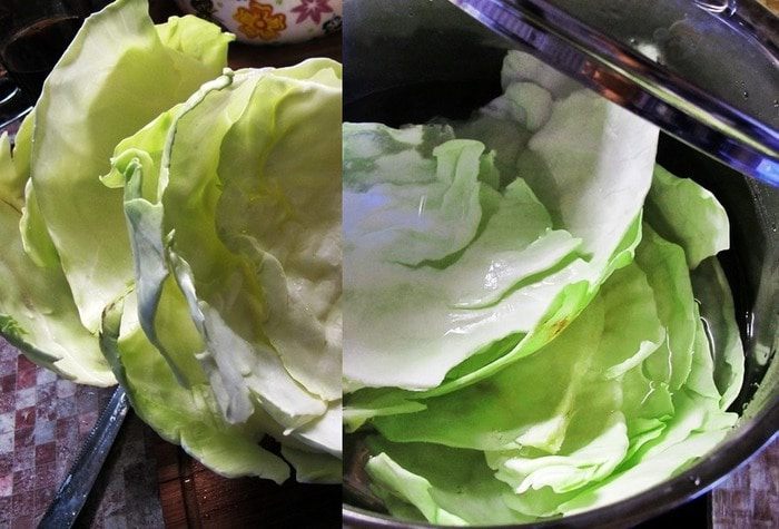Капусту вымыть, разобрать на листья. Если при этом они при этом повредятся, это не страшно. В фарш добавить соль и специи по вкусу. Поставить на огонь кастрюлю с водой, добавить 1 ст. л. соли, довести до кипения. Убавить огонь, положить капусту и проварить около 8 минут. Вынуть листья шумовкой и положить в дуршлаг, чтобы стекла вода.