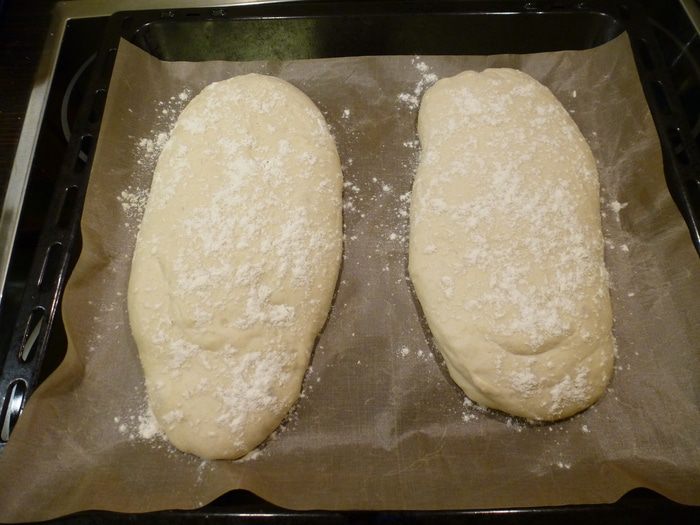 Чтобы тесто не прилипало, смазываем руки маслом. Делим тесто на 2 части и выкладываем на противень. Присыпаем сверху мукой и оставляем еще на 40 минут для расстойки, прикрыв полотенцем.