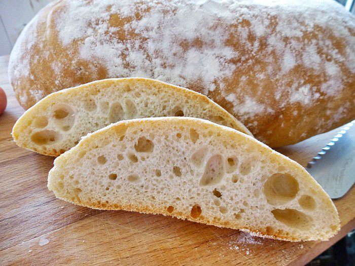 Чиабатту хорошо использовать для приготовления бутебродов и брускетт. А еще из нее можно делать хрустящие гренки к супу-пюре, но это уже другая история и следующий рецепт...