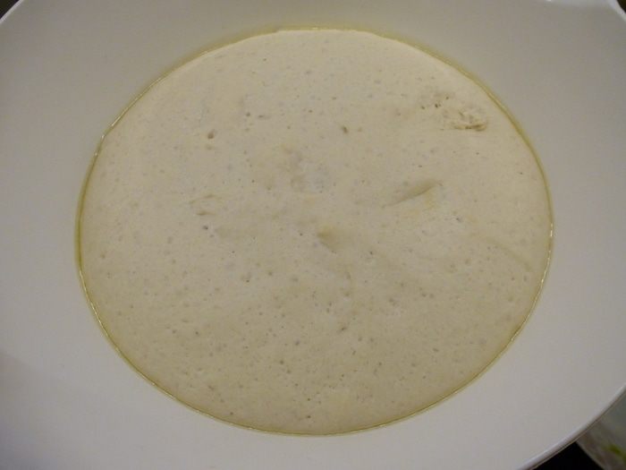 Смазываем миску оливковым маслом и перекладываем в нее тесто. Накрываем полотенцем и оставляем еще на 1 час.