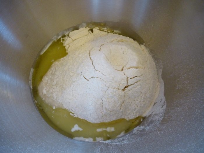 Распускаем дрожжи в теплой воде. Добавляем оливковое масло, соль, опару. Просеиваем муку и замешиваем тесто.