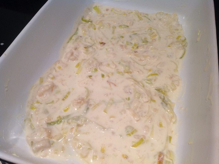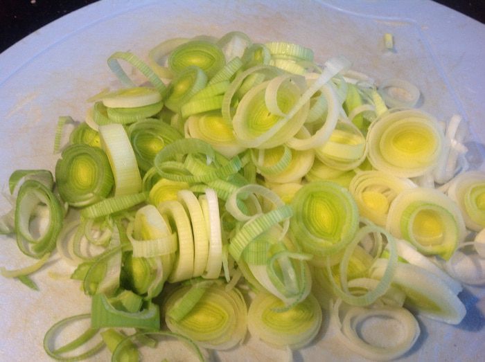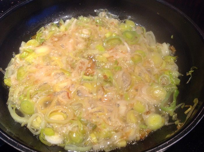 Сначала приготовим соус: тонко порежьте лук-порей. Разогрейте сковороду на небольшом огне, налейте 1 ст л масла и обжарьте на нем лук до мягкости.
