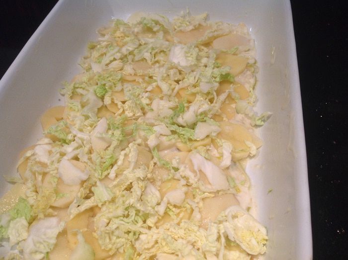 В соус выложите 1/3 часть ломтиков картофеля, посолите. Сверху выложите половину капусты и...