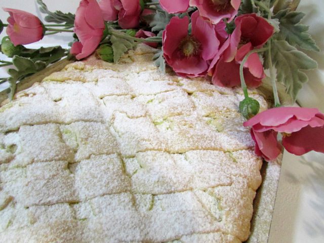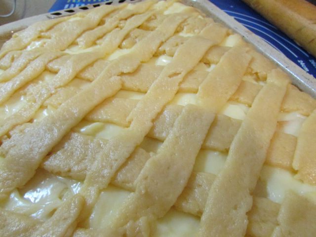Сверху выложить вторую часть теста, я попыталась нарезать полоски и выложить на крем в виде решетки (кривенько, но я старалась))) ).