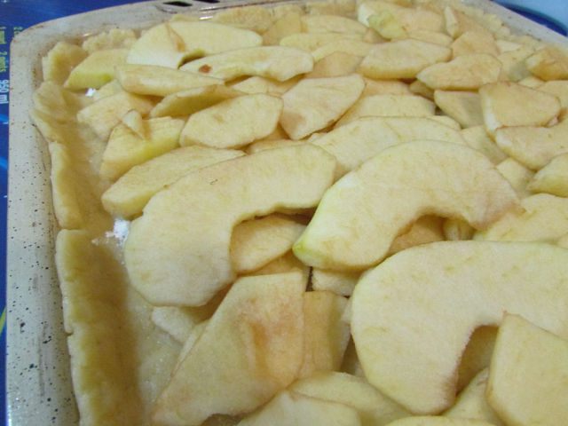 Тесто разделить на 2 неравные части. Выложить большую часть теста в прямоугольную форму, оформляя небольшие бортики. Тесто присыпать крахмалом и разложить яблоки.