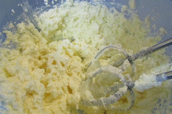 Маргарин и 200 г сахара взбить миксером до состояния белой массы.