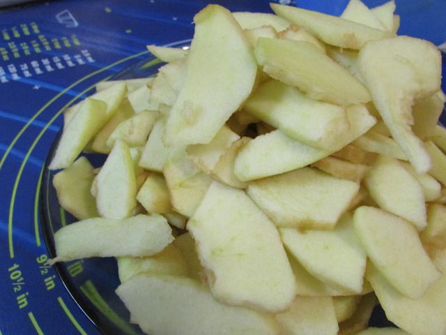 Яблоки помыть, очистить от шкурки и семян. Нарезать тонкими пластинками.