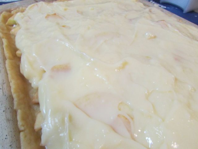 Горячий пудинг выложить на яблоки и разровнять.