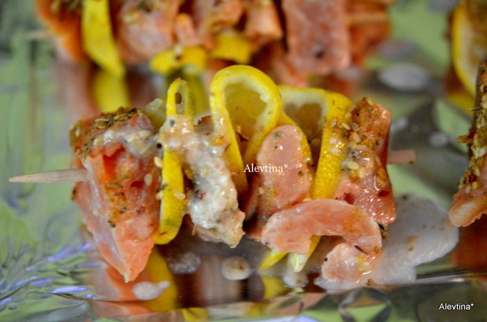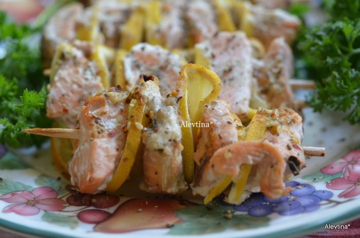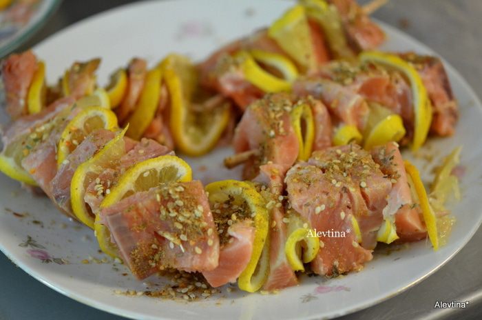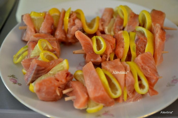 Филе семги порезать на кусочки. Слегка сбрызнуть оливковым маслом. Нанизать на шпажки чередуя с лимоном.
