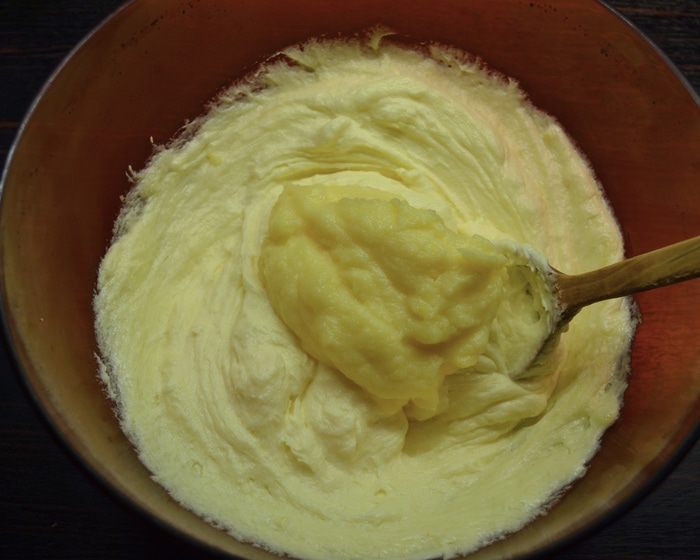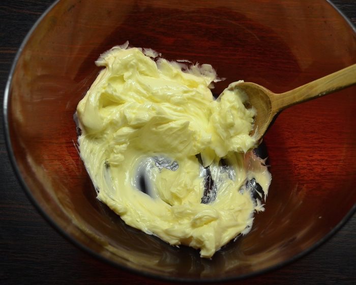 Заканчиваем готовить крем... Размягченное масло растереть с помощью деревянной ложки (в данном случае, я готовлю все "дедовским" способом...) Как только масло посветлеет и начнет превращаться в пышную массу...