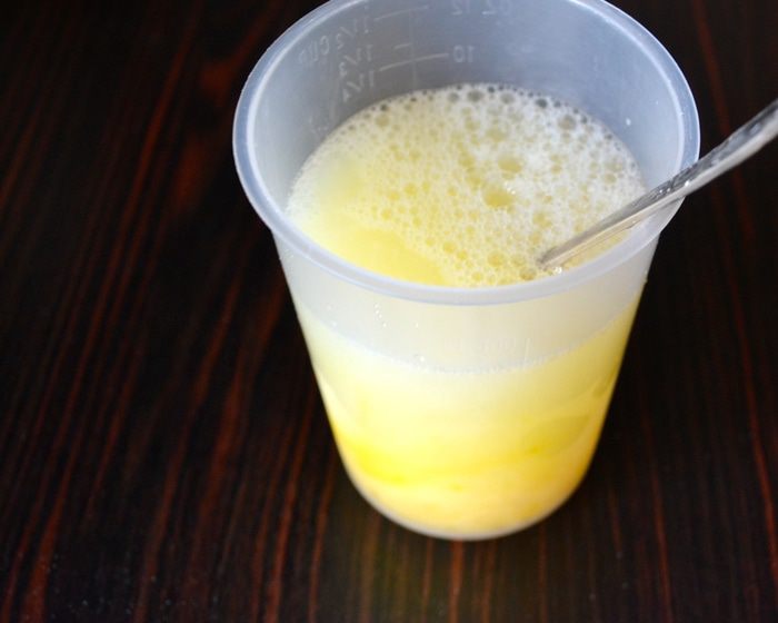 В стакан разбить яйцо, добавить щепотку соли и слегка взбить вилкой. Долить водой до 250 мл.