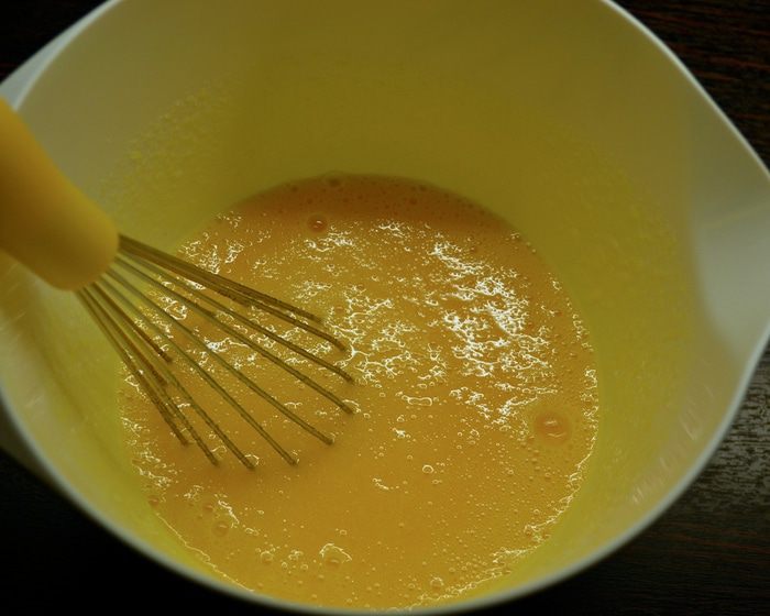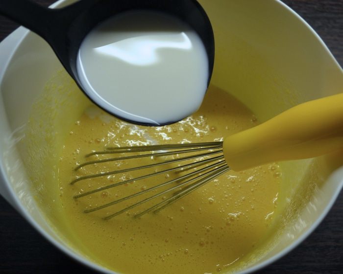 Для крема молоко налить в кастрюлю и поставить нагреваться. Яйца разбить в миску и взбить венчиком вместе с сахаром и ванилью. Добавить муку и еще раз все хорошо размешать.