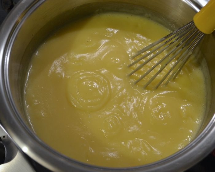 Добавить пару половников горячего молоко в яичную смесь, размешать. После чего влить весь крем в кастрюлю с молоком...