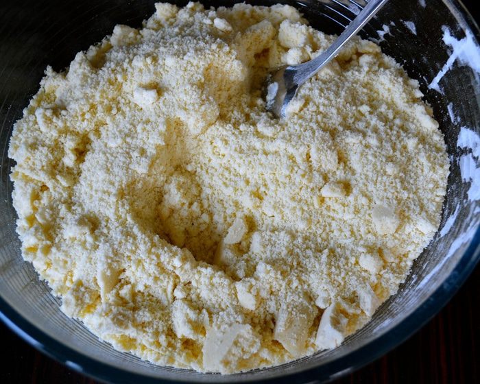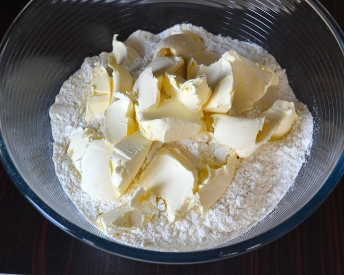 В большую миску просеять муку и добавить кусочки сливочного маргарина.