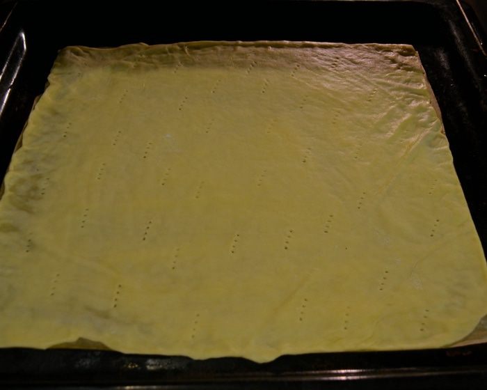 Тем временем достаем тесто из холодильника и делим на 7-8 частей. Духовку включить разогреваться на 180°C. Далее раскатываем коржи ОЧЕНЬ ТОНКО на пекарской бумаге! Я делаю так - вырезаю из бумаги сразу два прямоугольника (размером примерно 27 Х 33 см)... Пока выпекается один корж, занимаемся раскатыванием другого... Можно помогать себе немного пальцами рук. Раскатанный корж накалываем по всему периметру вилкой. Выкладываем на противень...