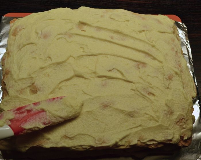...., начинаем добавлять по 2 ложки заварного крема (полностью остывшего!) и продолжаем взбивать. Крема получается много, но нам весь потребуется для смазывания торта.